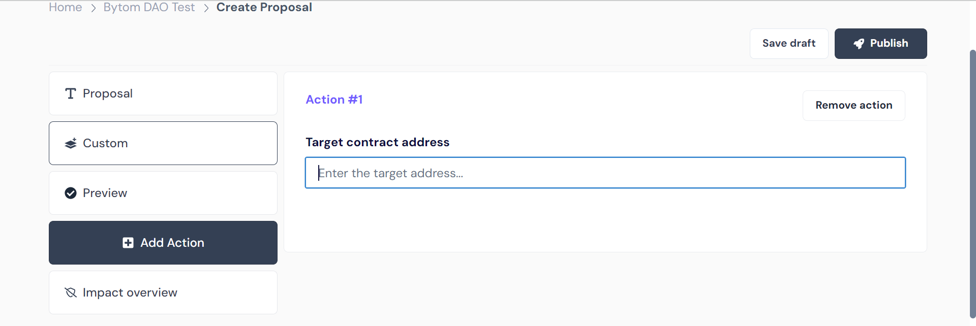 If your proposal involves adjusting governance parameters or using treasury assets, you need to add an "Action." Here, we recommend using the Custom action feature.